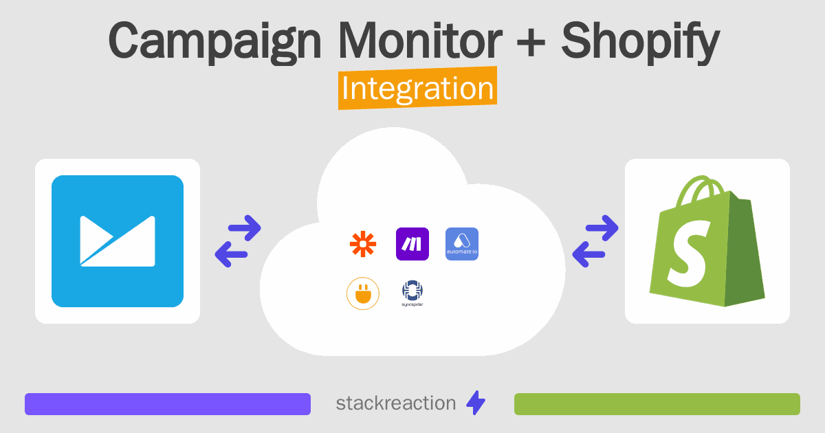 - You can connect Campaign Monitor and Shopify automatically using no-code Workflow Automation Tool. Use Make.com, Zapier, SyncSpider, Pabbly Connect, Integrately or Pipedream to link Campaign Monitor and Shopify.