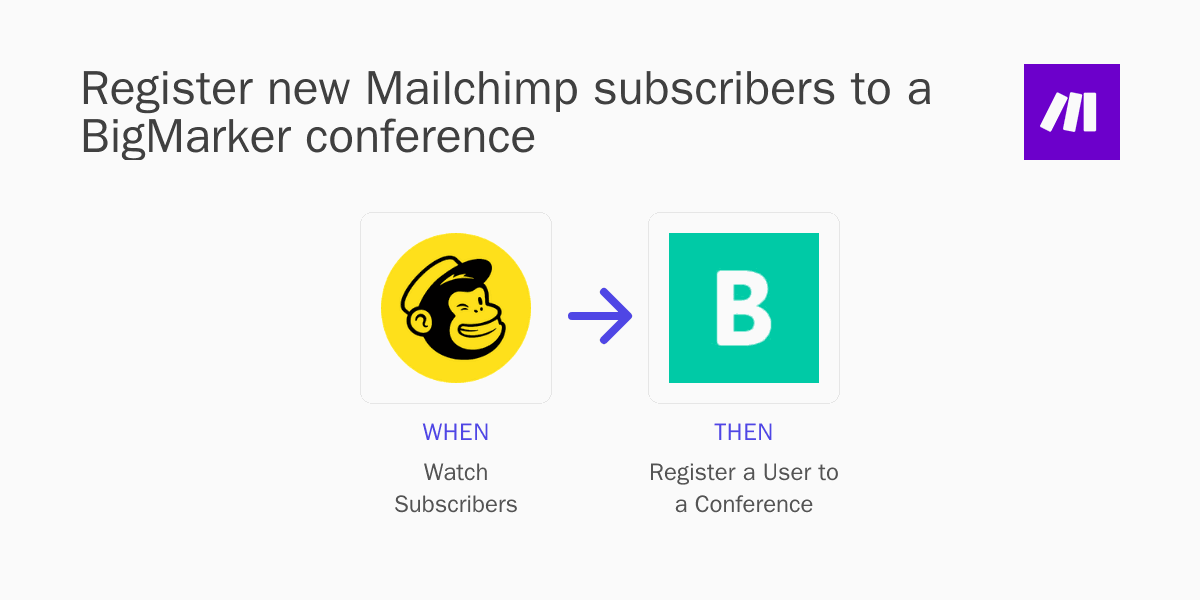 This guide contains information on how to set up an automatic workflow that allows to Register new Mailchimp subscribers to a BigMarker conference.
