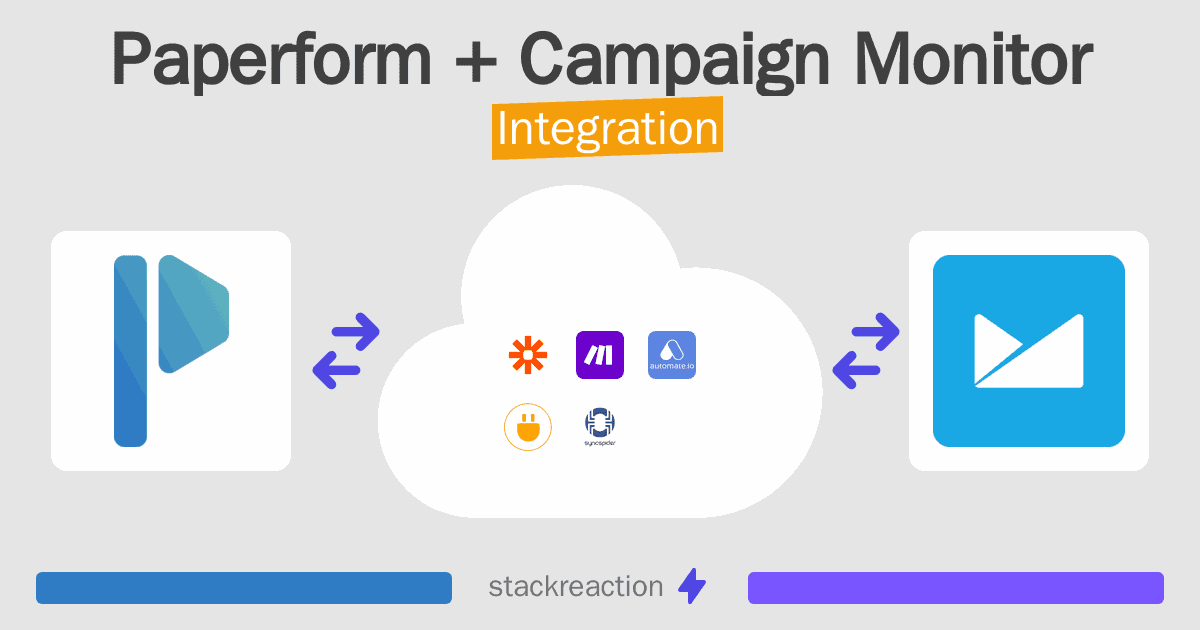 - You can connect Paperform and Campaign Monitor automatically using no-code Workflow Automation Tool. Use Make.com, Zapier, SyncSpider, Pabbly Connect, Integrately or Pipedream to link Paperform and Campaign Monitor.