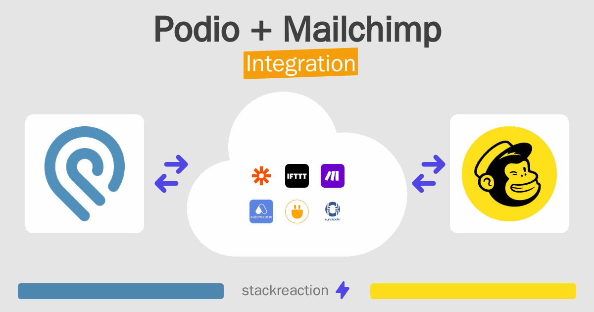 - You can connect Podio and Mailchimp automatically using no-code Workflow Automation Tool. Use Make.com, Zapier, SyncSpider, Pabbly Connect, IFTTT, Integrately, Albato or Pipedream to link Podio and Mailchimp.